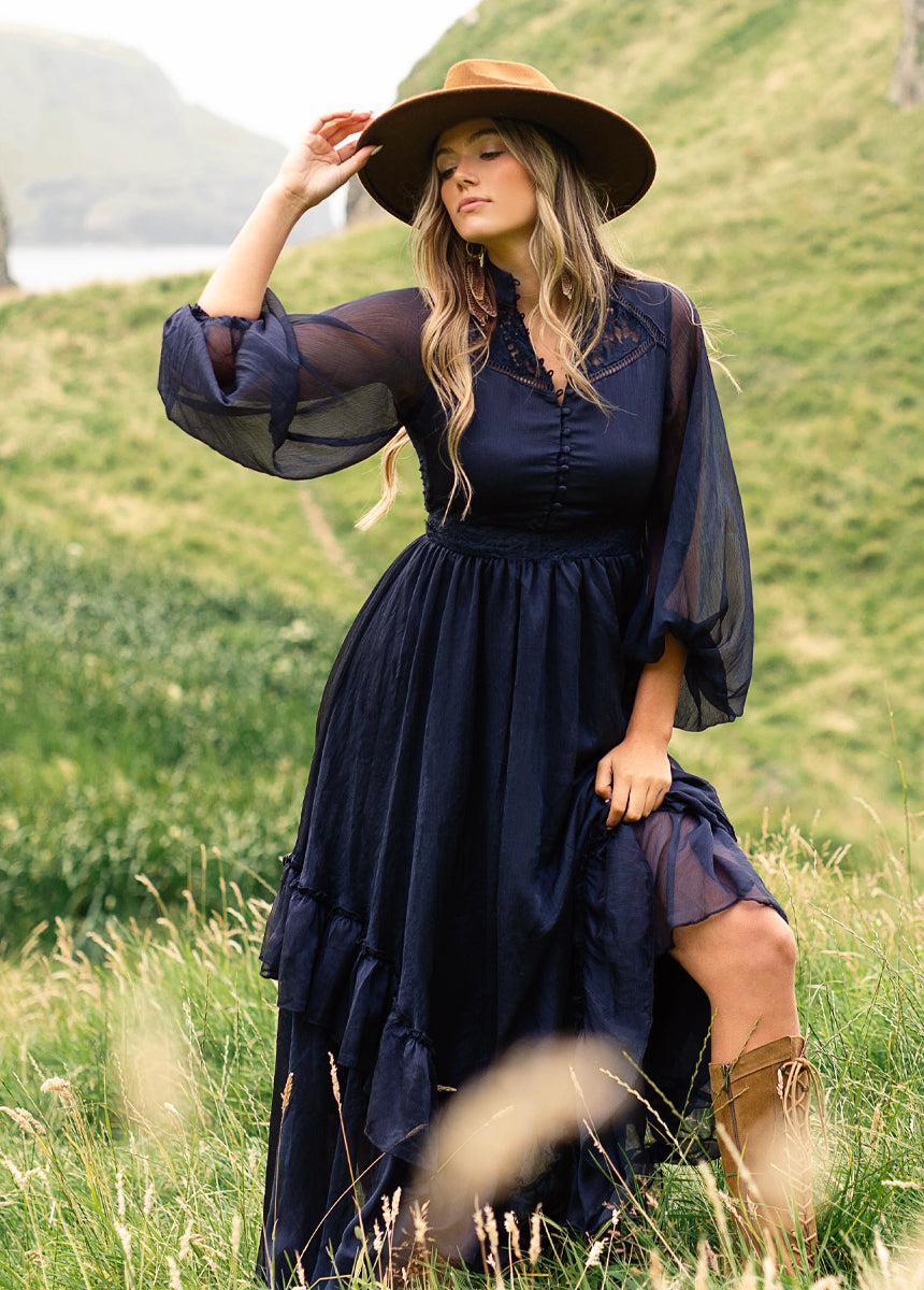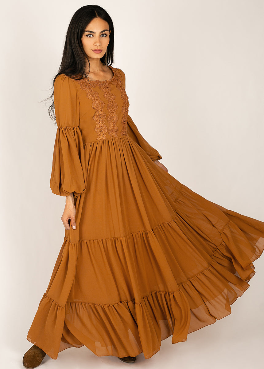 Modest and appropriate but never boring, this gorgeous earth-toned dress is the perfect boho piece for your visits to church. With a full flowy skirt, large bishop sleeves, and intricate bodice, this dress makes a subtle statement while still staying church-appropriate. We love how dramatic this piece is in its details but classic in its shape, making it a great timeless choice for a variety of occasions.