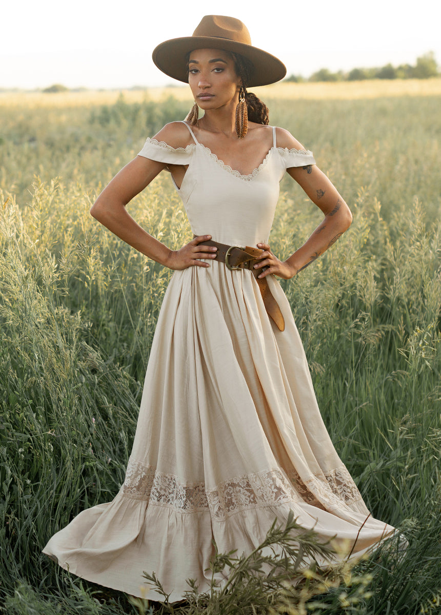 The Gia is a breath of fresh air that can easily be worn both in and out of church. It features a wide boat neck, along with ruching and ties at the shoulders for a comfortable fit, all flaring down into a lightweight floaty skirt with a handkerchief hem. This boho-inspired beauty is demure and detailed all in one for an easy and fashionable church fit.