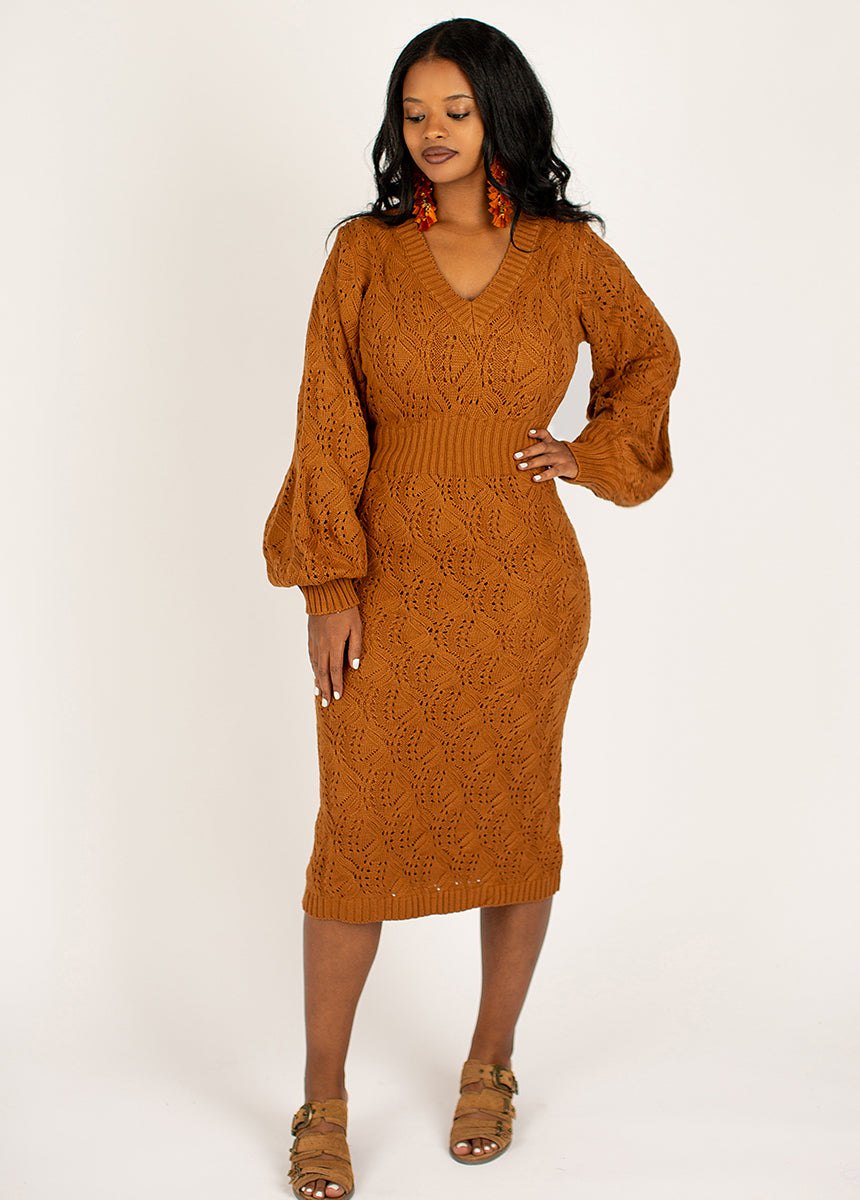You can never go wrong with a sweater dress, especially when it’s one as gorgeously flattering as the Estee! This midi-length sweater dress oozes comfort and autumnal festivity with its earthy color palette, comfy bishop sleeves, and plenty of texture. It would also be a great outfit for dressing up for your Thanksgiving festivities!