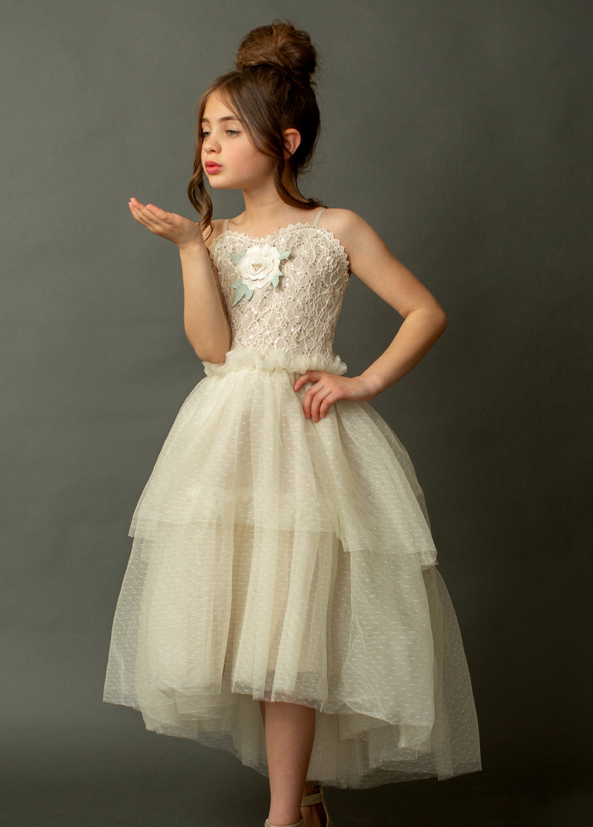Formal and free-spirited all at once, the Maia Impact Dress is the perfect Bat Mitzvah dress for making a statement. Its elegant and long train is balanced perfectly with a free-flowing tulle skirt, making it an excellent dress for Bat Mitzvahs who want to leave a lasting impression and announce their entrance into adulthood in style and grace. Buying this dress is also a good deed: with each purchase of the Maia Impact Dress, $50 of the price will be donated to the charity Freedom & Fashion.