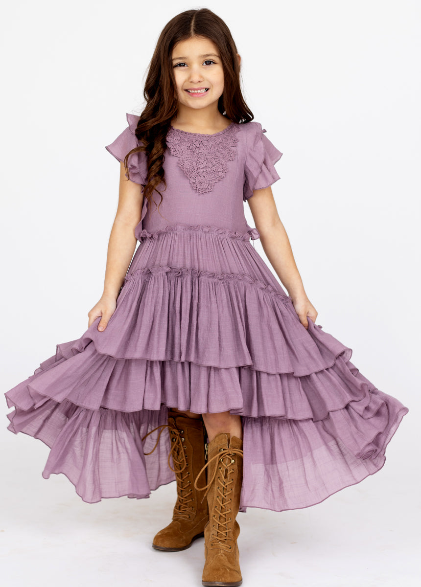 The Lunette is as sweet as can be! With a tiered ruffled skirt and sleeves, plus s a delicate lace embroidered front, this tea party-ready dress is one that your flower girl is going to be twirling around in all night long. This would be a great option for garden weddings on a beautiful grounds, especially so if your bouquets and flower petals are the same delicate orchid color.