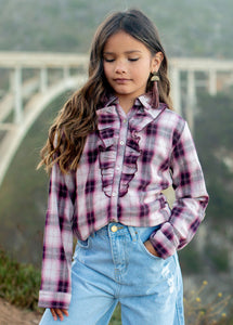 Fit true to size. Such a cute flannel, the ruffle detail is darling!