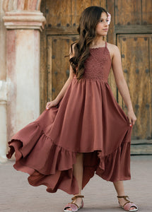 Effortlessly elevate her style with the Amala Dress in Clay. This high-low dress features intricate embroidery, adding a unique touch to any look.