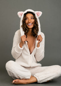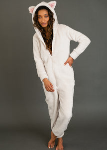 Soft one-piece sleep jumpsuit in a cozy fabric with a fun kitty twist.