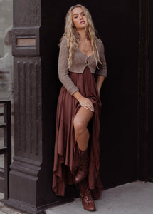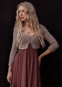 This chic cropped sweater features a V-neckline that adds a touch of effortless sophistication. Designed with long sleeves and finished with self-fabric bound edges, it delivers both comfort and a polished look. The two-button front closure with real shell buttons brings a refined, natural detail that elevates its style. A double needle coverstitch hem ensures durability while keeping the silhouette sleek and modern. Perfect for pairing with high-waisted skirts or jeans, this versatile piece is a must-have for any boutique wardrobe.
