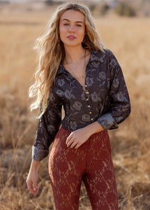 This relaxed-fit top blends effortless comfort with modern sophistication. It features a button front with delicate elastic loops, adding a subtle touch of charm to its easy silhouette. The slightly dropped shoulder seams and high-low saddle-shaped hem give it a laid-back yet refined look. Long sleeves with cuffs and a placket bring a tailored finish to the design. Cropped to the perfect length, this top pairs beautifully with high-waisted jeans or skirts for a chic, everyday outfit.