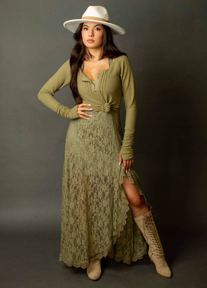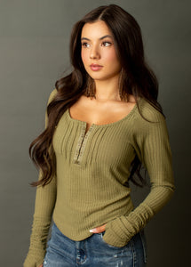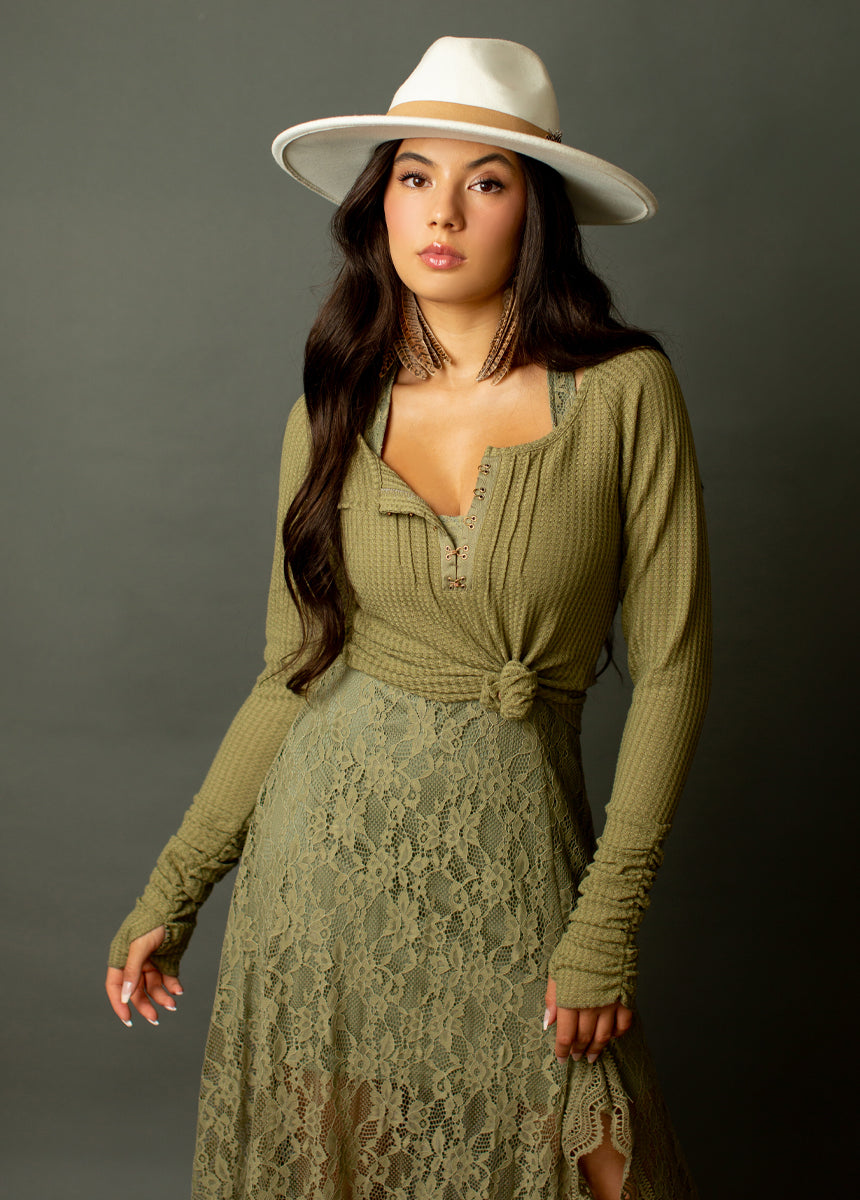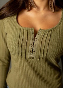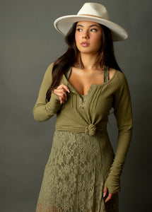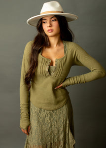 The details on this top really make me enjoy styling it, and the fit and softness make me want to wear it all the time! Details I love: waffle fabric, shirring on sleeve, thumb holes, wide scoop neckline, hook and eye closures, fitted bodice, and scooped hemline. It's incredibly flattering and versatile!