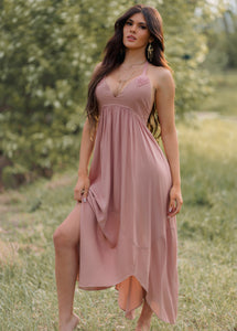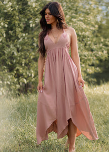 The Alyssum Dress blends romantic lace with a modern, figure-flattering silhouette. A deep V-neckline at the front is elevated by an intricate lace panel that extends into a halter-style neckline for a striking, feminine look. Thin shoulder straps and a structured bust with shaped cup panels provide both support and elegant definition. The open-back design is beautifully detailed with a vertical lace panel that adds depth and allure. Flowing softly from the bodice with gentle gathering, the skirt creates graceful movement perfect for special occasions or elevated boutique styling.