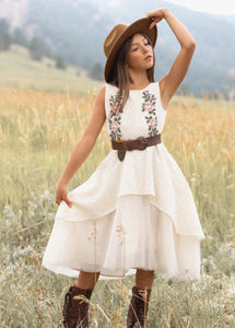This Amberlyn dress embodies Enchanted, Grace and elegance bloom. This is perfect for special occasions. The bodice features intricate floral embroidery with soft pink and green hues, adding a delicate and feminine charm. Crafted from eyelet lace, the sleeveless top offers a refined yet playful look. The tiered skirt flows into a layered tulle underlay, creating a dreamy and voluminous silhouette. The back showcases a smooth, seamless finish for a polished look. Paired with ankle boots or dress shoes, this dress is ideal for weddings, garden parties, or any event where a touch of whimsy and sophistication is desired.