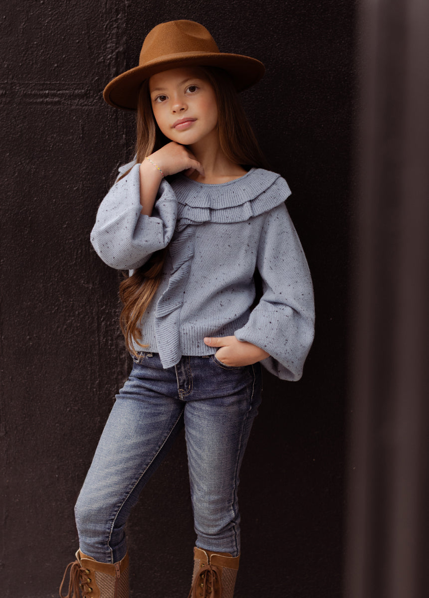 Elevate your little one’s wardrobe with this charming girls' top featuring a delicate ruffle neckline and playful center-front ruffles. Designed with a relaxed fit, it ensures all-day comfort for active play or special outings. The full-length bishop sleeves add an elegant touch, making it perfect for layering or standalone wear. A ribbed bottom hem provides a snug finish, while the stylish details make it a versatile piece for any occasion. Ideal for pairing with jeans, skirts, or leggings, this top is a must-have for effortless, chic styling.