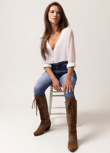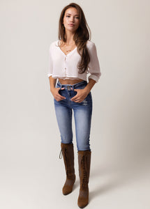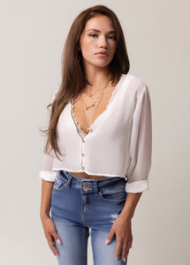 This chic crop top brings a touch of elegance to everyday style with its tailored details and flattering cut. The neckline and center front are finished with self-fabric facing for a refined, seamless look. Long sleeves with buttoned cuffs and a self-fabric back yoke add structure, while real shell buttons with elastic loops provide both function and sophistication. Designed with a clean double needle hem stitch, it balances durability with boutique-level craftsmanship. Perfect for pairing with high-waisted skirts or denim, this top transitions effortlessly from day to night.