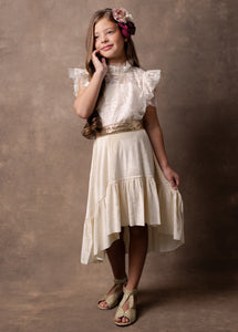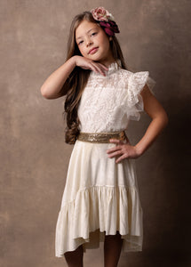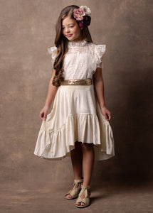 Introduce your little one to dreamy elegance with our lace and tulle top, inspired by the beloved Anouk Petticoat dress. The charming ruffle neckline adds a playful touch, while the structured ruffle sleeves enhance the overall design. Featuring a convenient back zipper and hook & eye closure, this top ensures easy dressing. The unlined yoke offers breathability and comfort for all-day wear. Perfect for special occasions or everyday adventures, this piece is a must-have for her wardrobe!