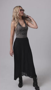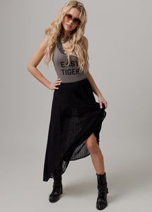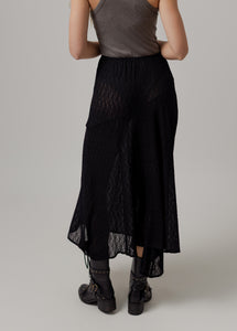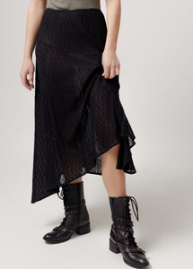 The Apple Maxi Skirt blends romantic texture with a modern, flowing silhouette. The waist seam connects to angled upper panels that shape the skirt beautifully through the hips. Vertical panel seams extend down toward the hem, creating a soft flare that moves gracefully as you walk. A gently uneven hem with curved shaping adds visual interest and a flattering finish. Crafted in sheer lace that subtly reveals the underlayer or a hint of leg, this boutique skirt brings feminine charm and effortless sophistication to any outfit.