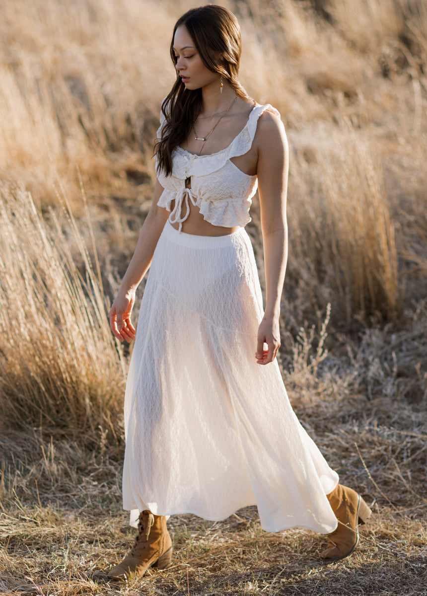 The Apple Maxi Skirt blends romantic texture with a modern, flowing silhouette. The waist seam connects to angled upper panels that shape the skirt beautifully through the hips. Vertical panel seams extend down toward the hem, creating a soft flare that moves gracefully as you walk. A gently uneven hem with curved shaping adds visual interest and a flattering finish. Crafted in sheer lace that subtly reveals the underlayer or a hint of leg, this boutique skirt brings feminine charm and effortless sophistication to any outfit.