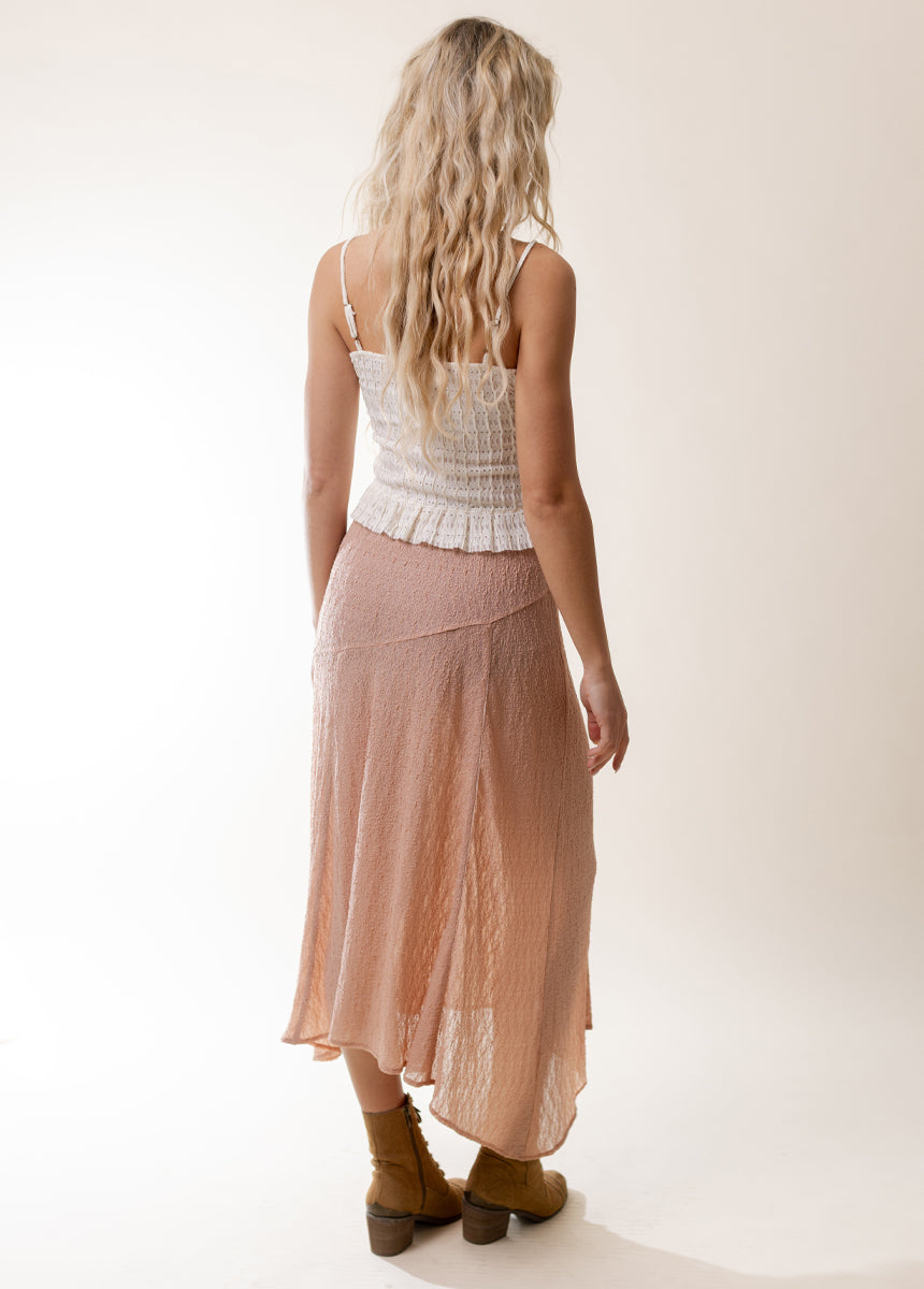 The Apple Maxi Skirt blends romantic texture with a modern, flowing silhouette. The waist seam connects to angled upper panels that shape the skirt beautifully through the hips. Vertical panel seams extend down toward the hem, creating a soft flare that moves gracefully as you walk. A gently uneven hem with curved shaping adds visual interest and a flattering finish. Crafted in semi-sheer lace that subtly reveals the underlayer or a hint of leg, this boutique skirt brings feminine charm and effortless sophistication to any outfit.
