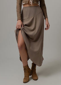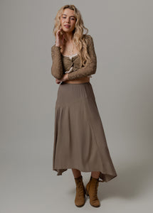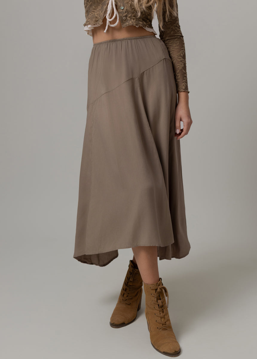 The Apple Maxi Skirt blends romantic texture with a modern, flowing silhouette. The waist seam connects to angled upper panels that shape the skirt beautifully through the hips. Vertical panel seams extend down toward the hem, creating a soft flare that moves gracefully as you walk. A gently uneven hem with curved shaping adds visual interest and a flattering finish. Crafted in semi-sheer fabric that subtly reveals the underlayer or a hint of leg, this boutique skirt brings feminine charm and effortless sophistication to any outfit.