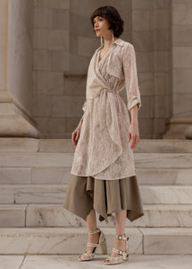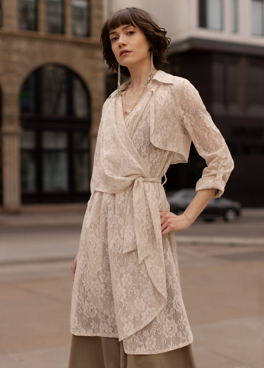 The Ari Duster flows beautifully with draped panels that cascade from the neckline all the way to the hem. The collar and neckline are finished cleanly, giving it a polished, boutique-ready look. A sleeve adjuster tab adds versatility, letting you style the sleeves rolled or relaxed. The waist seam is paired with belt loops and a wide 2-inch self-fabric belt that lets you define your shape effortlessly. Finished with a softly flared, full-length hem, this duster brings movement, sophistication, and modern ease to any outfit.