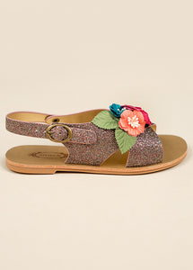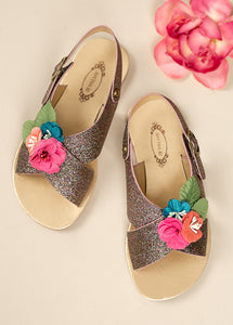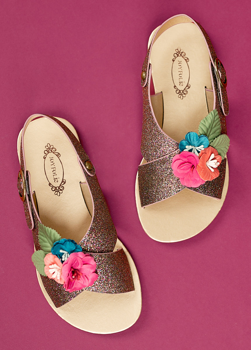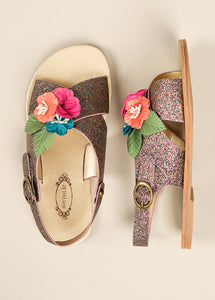 Colorful florals and a sparkle shine, gives these basic sandals a fashionable flare.