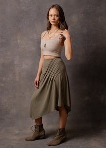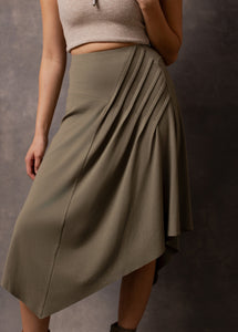 This chic skirt combines modern structure with effortless elegance. It features an asymmetrical hemline that adds movement and a touch of edge to your look. A diagonal seam runs from the waist to the hem, enhanced by delicate pleats that fan gracefully from one side for a flattering, sculpted shape. The smooth, fitted waistband ensures a comfortable and secure fit that defines your waist beautifully. Perfect for pairing with blouses or fitted tops, this skirt transitions seamlessly from day to night.
