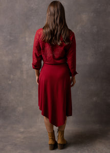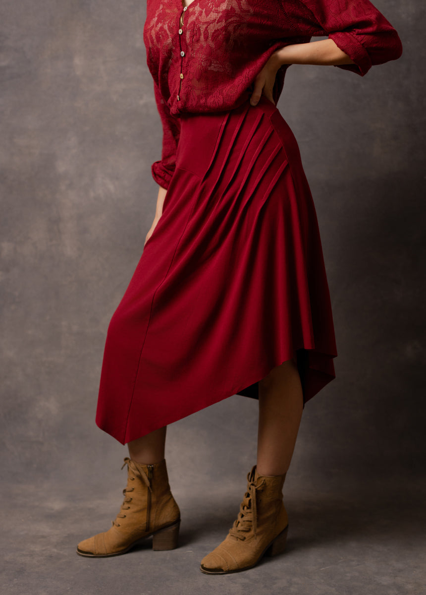 This chic skirt combines modern structure with effortless elegance. It features an asymmetrical hemline that adds movement and a touch of edge to your look. A diagonal seam runs from the waist to the hem, enhanced by delicate pleats that fan gracefully from one side for a flattering, sculpted shape. The smooth, fitted waistband ensures a comfortable and secure fit that defines your waist beautifully. Perfect for pairing with blouses or fitted tops, this skirt transitions seamlessly from day to night.