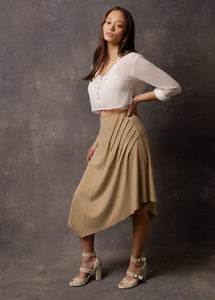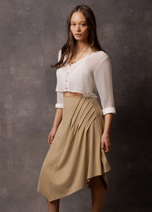This chic skirt combines modern structure with effortless elegance. It features an asymmetrical hemline that adds movement and a touch of edge to your look. A diagonal seam runs from the waist to the hem, enhanced by delicate pleats that fan gracefully from one side for a flattering, sculpted shape. The smooth, fitted waistband ensures a comfortable and secure fit that defines your waist beautifully. Perfect for pairing with blouses or fitted tops, this skirt transitions seamlessly from day to night.