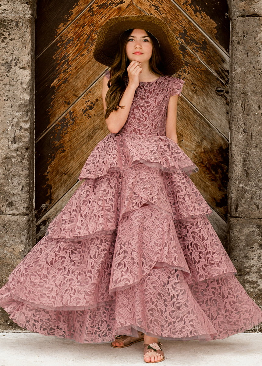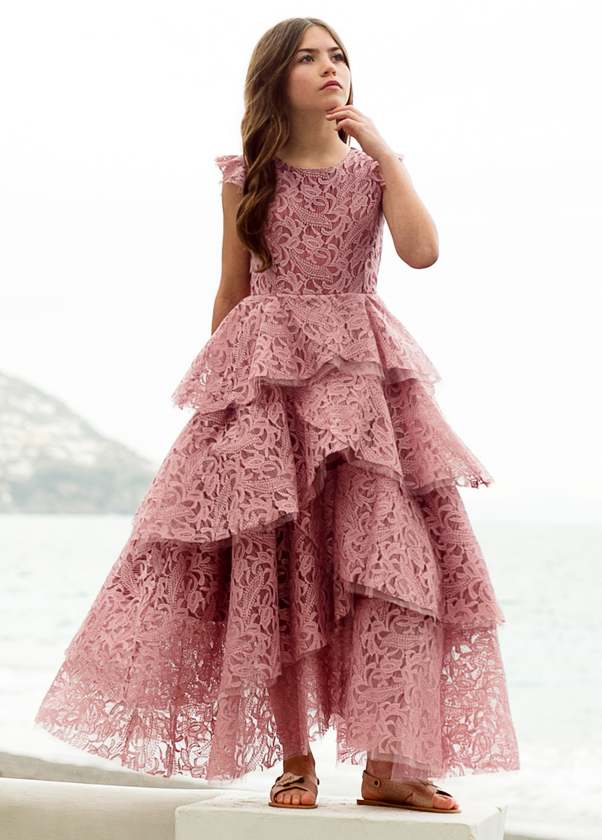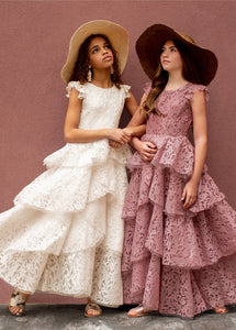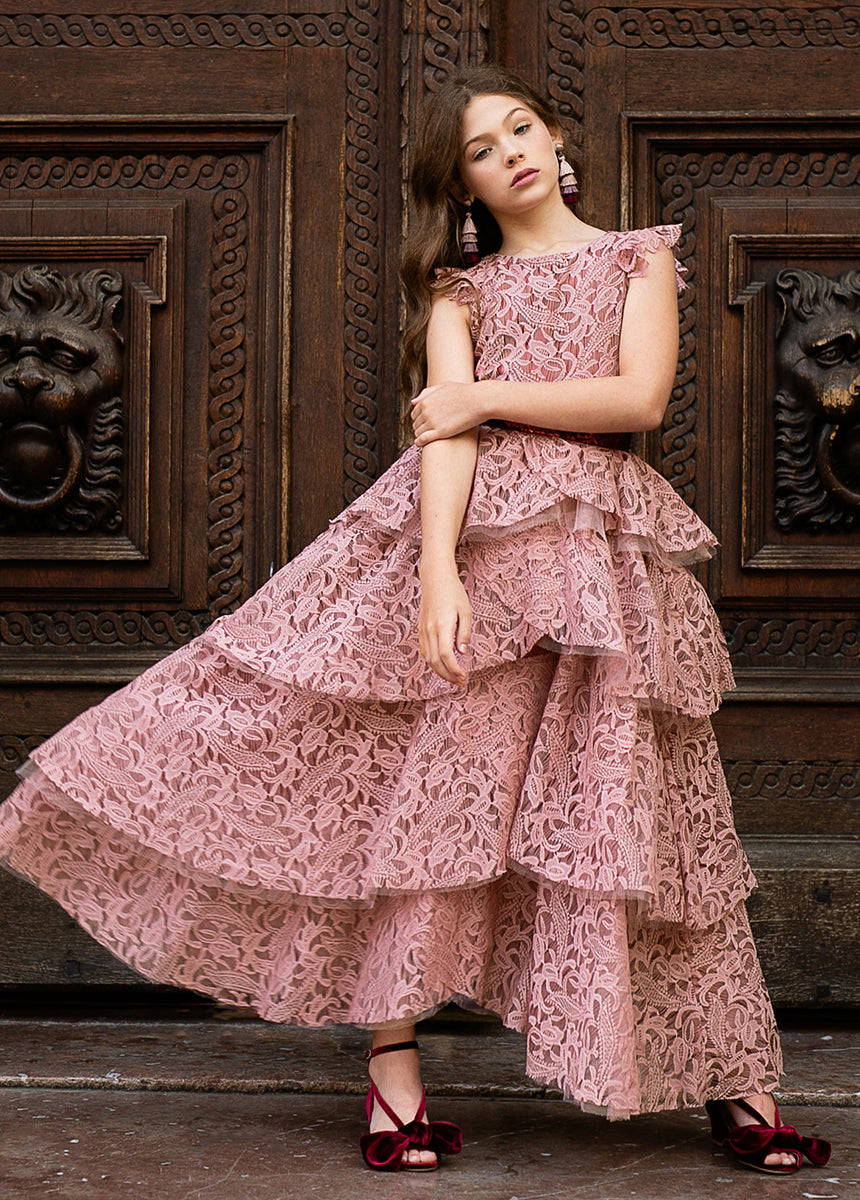 With cascading ruffles, back and lace details, this voluminous dress is sure to make a statement.  Inspired by our Anouk dress.