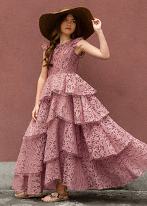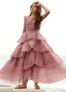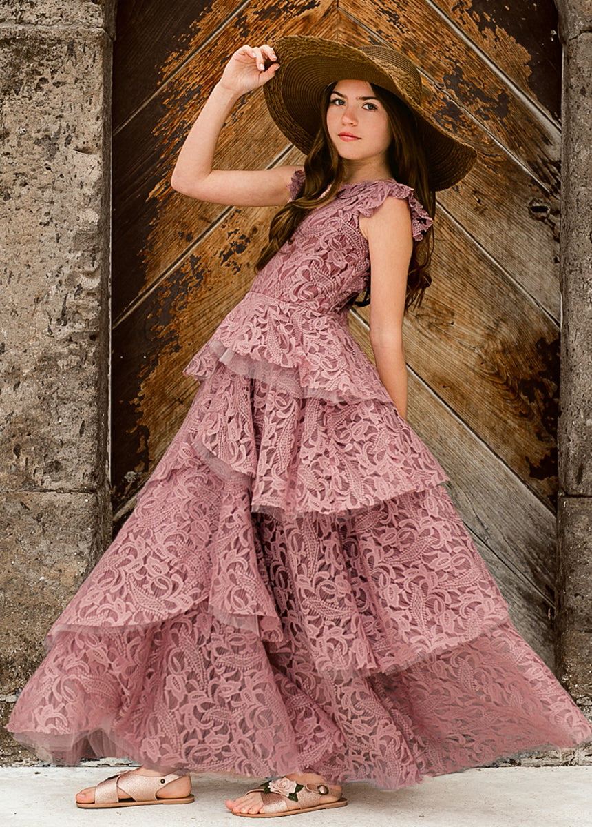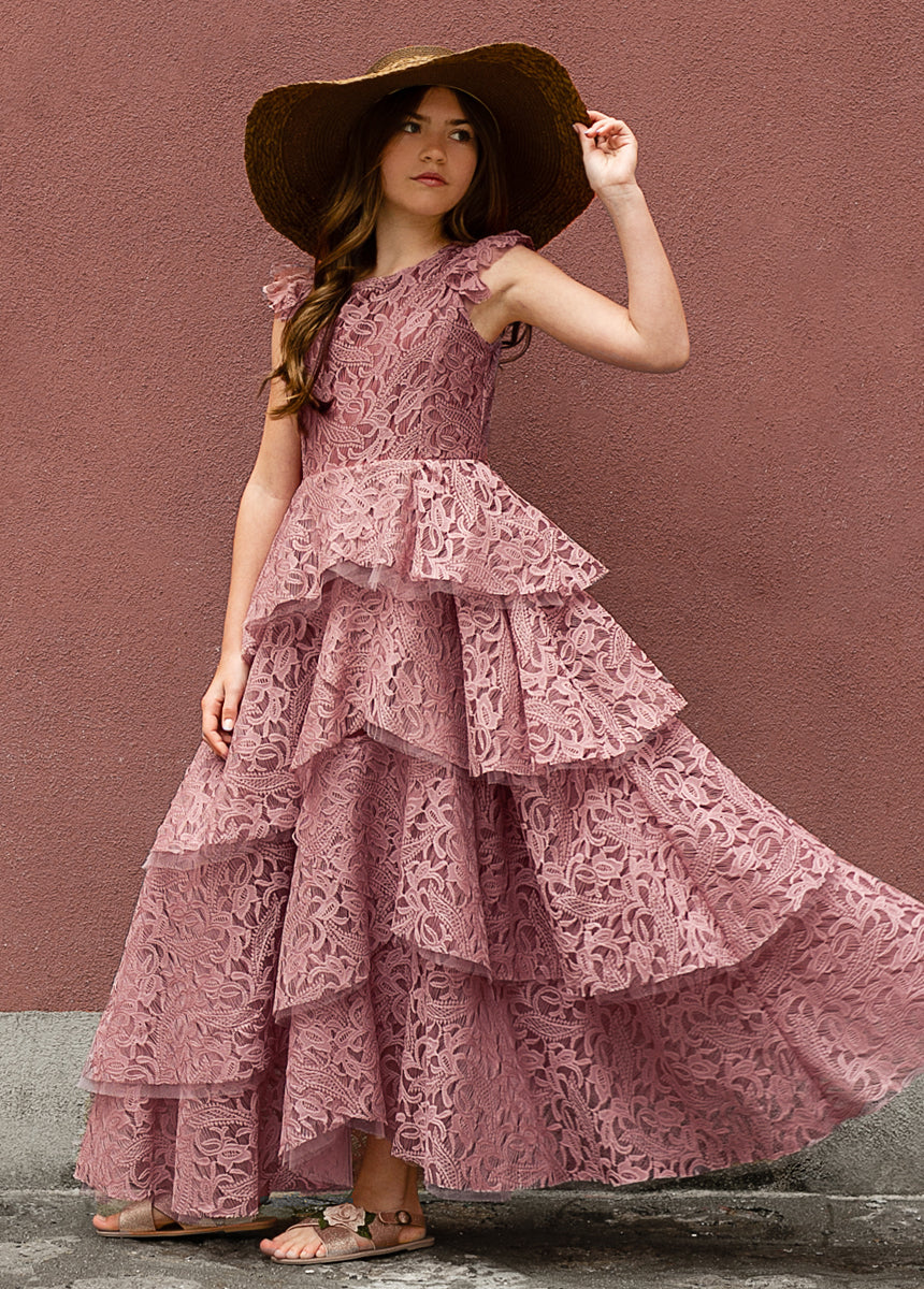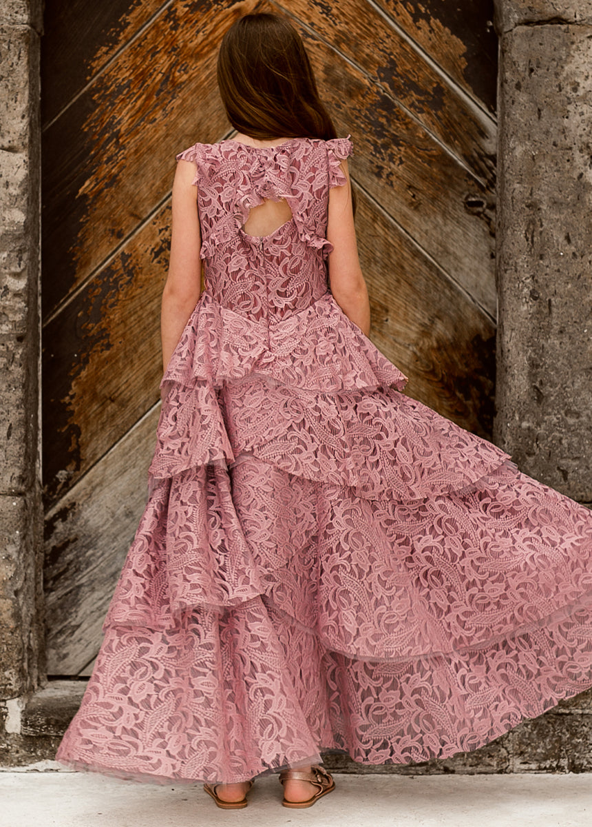 With cascading ruffles, back and lace details, this voluminous dress is sure to make a statement.  Inspired by our Anouk dress.