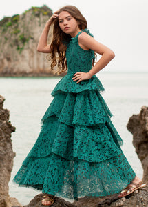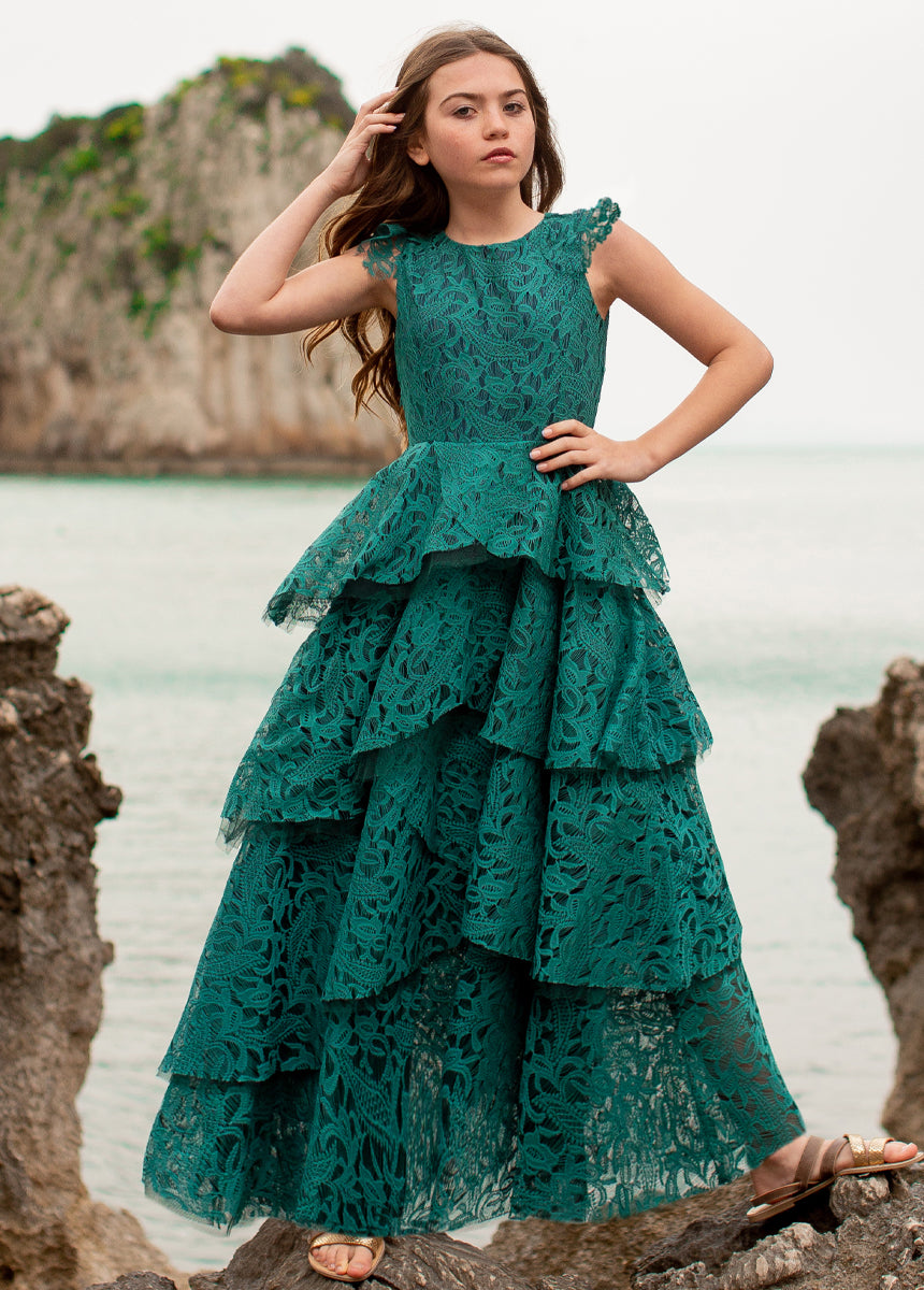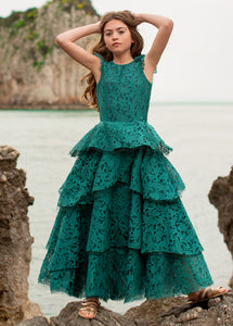 With cascading ruffles, back and lace details, this voluminous dress is sure to make a statement. Inspired by our Anouk dress.