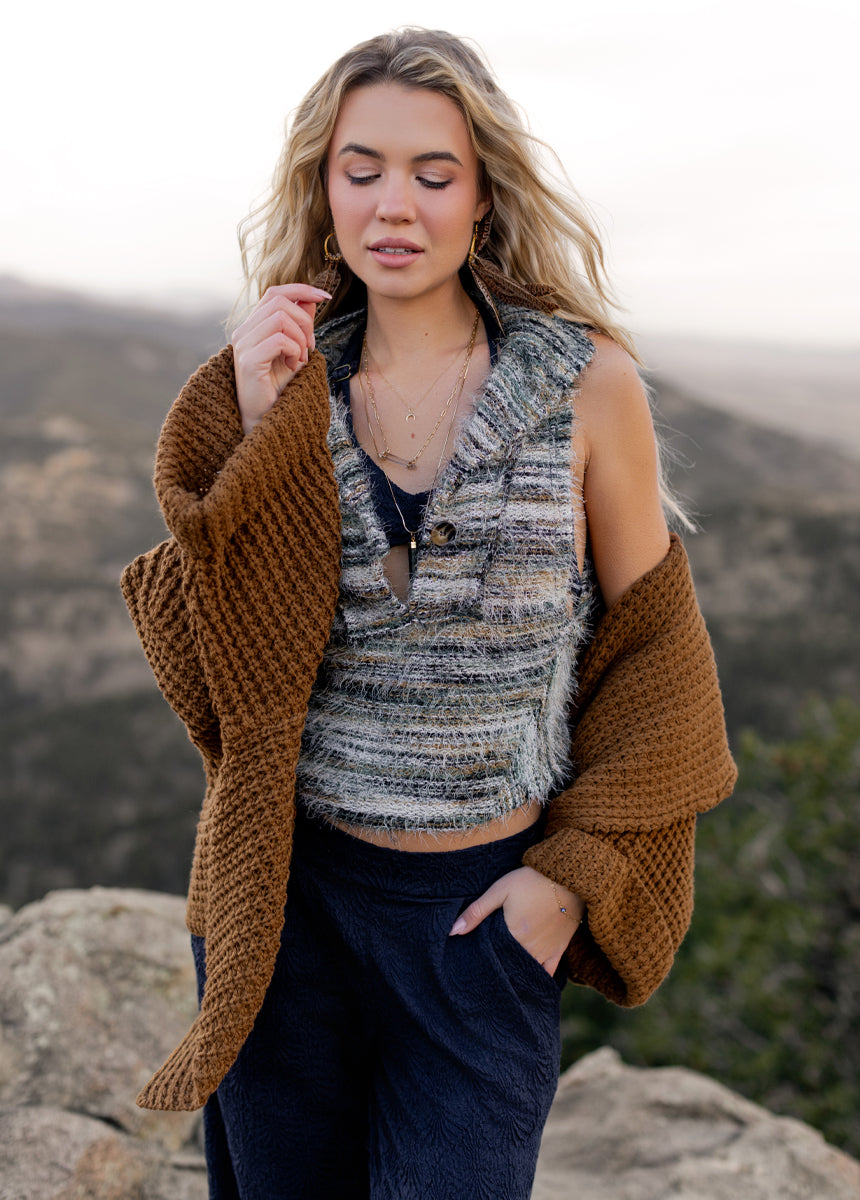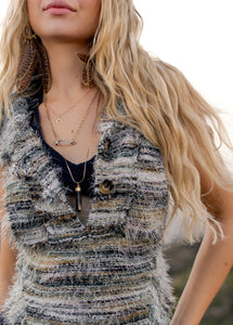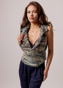This effortlessly cool sleeveless top brings a modern, boutique-worthy twist to a classic silhouette. The raw-edge collar and front placket give it a laid-back, lived-in feel while still looking polished. Five evenly spaced buttons run down the centre front, adding simple detail and easy styling. The curved shirt-tail hem, finished with a reverse coverstitch, creates a soft, flattering shape whether you wear it tucked or loose. Perfect for warm days or chic layering, this top blends casual charm with elevated style.