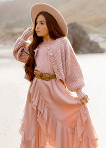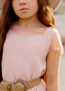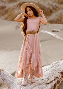 Introduce your little one to the enchanting world of girly boho fashion with our Belleann Dress in Desert Shell. This stunning maxi-length dress features a stylish high-low hem and a boat neckline, perfect for a trendy yet comfortable look. Delicate lace cap sleeves and intricate stretch lace detailing add feminine charm to every twirl. The flattering V-backline enhances the overall design, making it an ideal choice for special occasions. Crafted from 100% Polyester, the Belleann Dress ensures both comfort and elegance for your little fashionista.