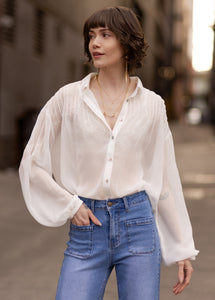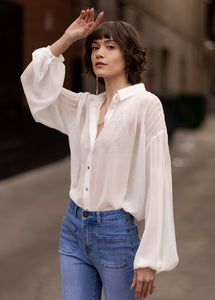 The Benedict Top brings timeless charm with a classic collar and collar stand for a clean, tailored look. Pintucks across the chest panels, sleeves, and back add texture and refinement, giving the piece a true boutique feel. A slightly dropped shoulder flows into elegant bishop sleeves that gather softly at the hem for a romantic, airy finish. The sleeve placket is secured with a single 10mm real shell button, while seven matching shell buttons line the center-front placket for an elevated touch. Effortlessly feminine and easy to style, this top pairs perfectly with denim, skirts, or tailored trousers for everyday sophistication.