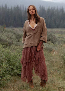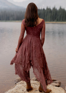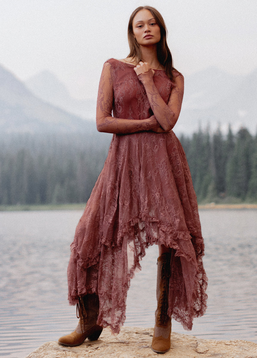 This dress features a boat-neckline and princess seams for a flattering, sculpted silhouette. The long sleeves include thumbholes finished with durable marrow stitching, adding both comfort and style. A layered lace skirt with ruffles sewn onto both tiers creates soft volume and movement. Topped-on ruffles with raw edges add a touch of modern texture, while an invisible zipper ensures a seamless fit. Perfect for weddings, date nights, or special events, this lace ruffle dress blends timeless elegance with contemporary boutique flair.
