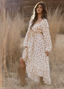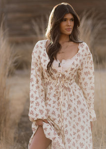 The Beri Dress is designed with delicate self ties at the neckline, creating a clean finish that doubles as a functional closure. A subtle one-needle edgestitch along the neckline and front opening adds a refined, boutique-quality touch. The waist features a drawcord tunnel, allowing you to cinch the silhouette for a flattering, adjustable fit. Sleeves are finished with self-fabric cuffs and soft encased elastic for comfortable shaping. Pearl merrow stitching along every ruffle edge completes the look with airy detail, making this dress perfect for feminine, effortlessly chic styling.