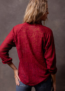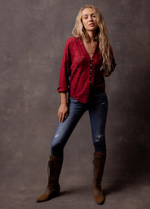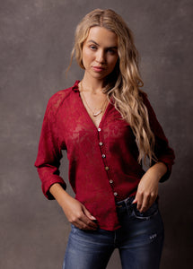 This elegant top blends timeless charm with feminine details for a polished, romantic look. It features a flattering V-neckline with a front button closure, finished with real shell buttons and delicate elastic loops for a refined touch. The self-fabric ruffle collar adds a soft, graceful accent that enhances the neckline beautifully. Long sleeves with self-bound placket cuffs offer a tailored yet comfortable fit. A skinny ladder trim along the raglan seams completes the design, adding a subtle touch of texture and sophistication.