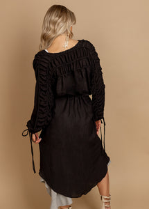 Add effortless elegance to your wardrobe with this flowy high-low duster, a standout piece! Featuring adjustable drawcord ties in the sleeves and a flattering waist tie, it offers a customizable fit for versatile styling. The rouched arms and back add a touch of boho, while the lightweight crepe fabric ensures a breezy, comfortable feel. Perfect as a layering piece over dresses, jeans, or shorts, this duster effortlessly transitions from casual outings to chic evenings. Elevate your collection with this light and airy high-low duster for a timeless, fashionable look!