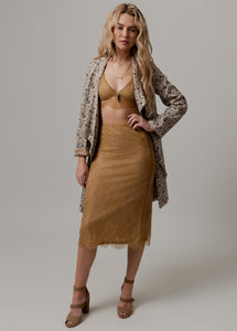 The Branwren Skirt blends soft elegance with a touch of modern edge. The waistband is lined with satin elastic for a comfortable fit, while delicate lace wraps over the top for a beautiful, feminine finish. An invisible zipper at the center back keeps the silhouette smooth and polished. The raw eyelash lace hem adds airy texture and a hint of allure. A back slit completes the look, offering easy movement and a subtly sophisticated finish perfect for any boutique wardrobe.
