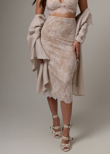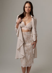 The Branwren Skirt blends soft elegance with a touch of modern edge. The waistband is lined with satin elastic for a comfortable fit, while delicate lace wraps over the top for a beautiful, feminine finish. An invisible zipper at the center back keeps the silhouette smooth and polished. The raw eyelash lace hem adds airy texture and a hint of allure. A back slit completes the look, offering easy movement and a subtly sophisticated finish perfect for any boutique wardrobe.