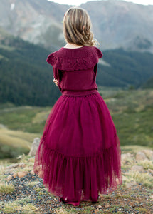 This dotted tulle midi length skirt features a tiered, full skirt perfect for fall and winter fashion.