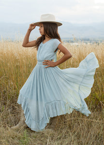 Make her feel effortlessly elegant in this boho maxi dress, perfect for your girls' wardrobe. Featuring short capped sleeves and a high-low hem with gathered ruffles, this dress offers a stylish, twirl-worthy design. The smocked waist ensures a comfortable and flattering fit, while the lace trim and tie at the back neckline add charming details. Crafted for special occasions or casual outings, this dress pairs beauty with comfort. Add this timeless boho maxi dress to her wardrobe for an enchanting look she'll love!