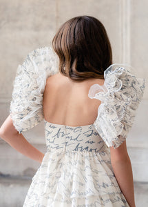 Make a statement with the Briony Dress in Script! This dress brings a fun and impactful silhouette to your wardrobe. The tulle adds a touch of whimsy, perfect for any occasion. Get ready to turn heads and make a statement in this unique dress.