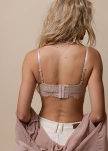The Bronarch Bralette blends feminine lace and thoughtful structure for a beautifully flattering fit. A shaped dart at each cup provides gentle contouring and support while keeping the silhouette soft and romantic. Raw eyelash lace edges trace the neckline and hem, adding a touch of airy elegance. Smooth 3/8" satin binding runs along the underarm and across the back, complemented by matching satin straps with adjusters for a customizable fit. Finished with a secure five-hook closure at the center back, this bralette is perfect for layering or wearing as a standout statement piece.