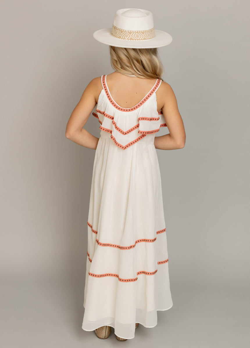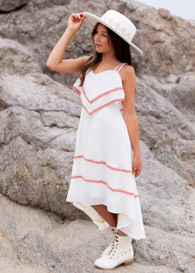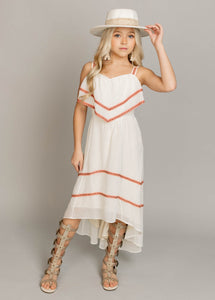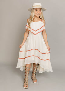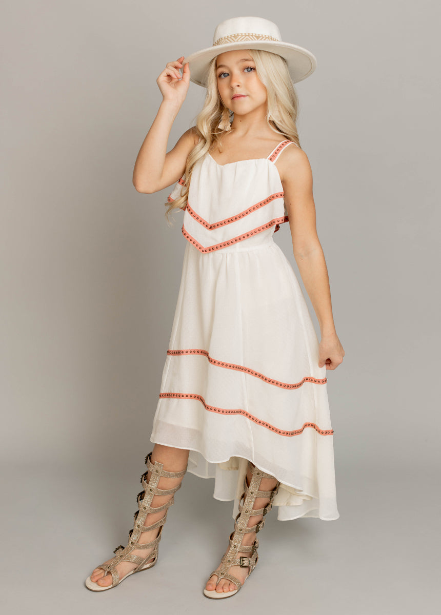 Add a touch of sparkle and sophistication to her wardrobe with the Bryanda Dress. Designed with a perfect balance of elegance and playful details, this dress features a flattering sweetheart neckline and a dramatic high-low skirt that moves beautifully with every step. Crafted from soft chiffon, it is both comfortable and stylish, with intricate studded trim detailing that adds a touch of sparkle and refinement. This dress will make your little one feel like a true princess.