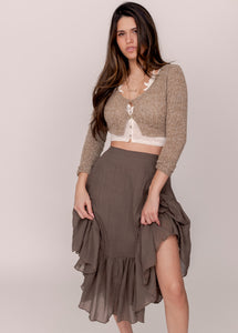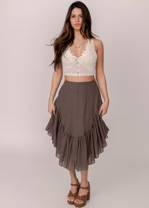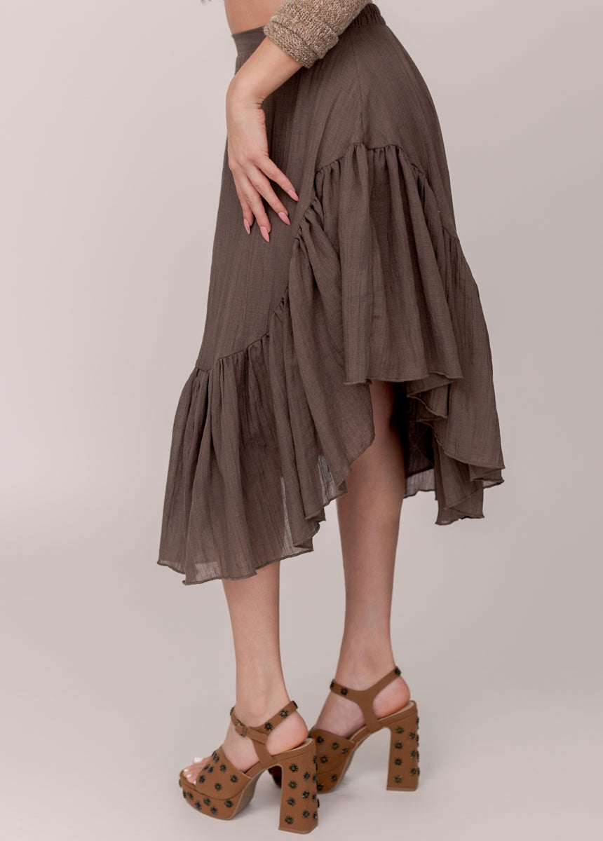 The Candy Skirt is designed with a smooth, flat front waistband for a clean, polished look. The waistband is self-lined with elastic at the back only, giving you a comfortable fit while keeping the front sleek and tailored. An asymmetrical layered design adds beautiful movement, with overlapping panels that create a soft, cascading effect. The curved hem falls to a flattering mid-calf length, making it easy to dress up or down. Perfect for pairing with fitted tops or flowy blouses, this skirt brings modern femininity to any boutique wardrobe.