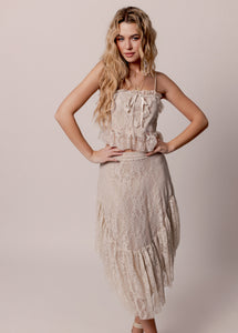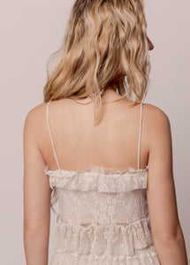 The Candy Top combines soft romance with boutique-worthy detail from every angle. Satin tubular “spaghetti” straps frame a straight neckline, topped with a gathered ruffle overlay for a delicate, airy touch. A lace inset panel at the center front, finished with a scalloped edge, adds a beautiful hint of texture, accented by a fixed satin bow for a charming finish. Three tiers of ruffles cascade across the neckline, giving the top a layered, graceful look. A bold 3-inch ruffle along the bottom hem completes the piece, creating movement and a silhouette that feels both playful and elegant.