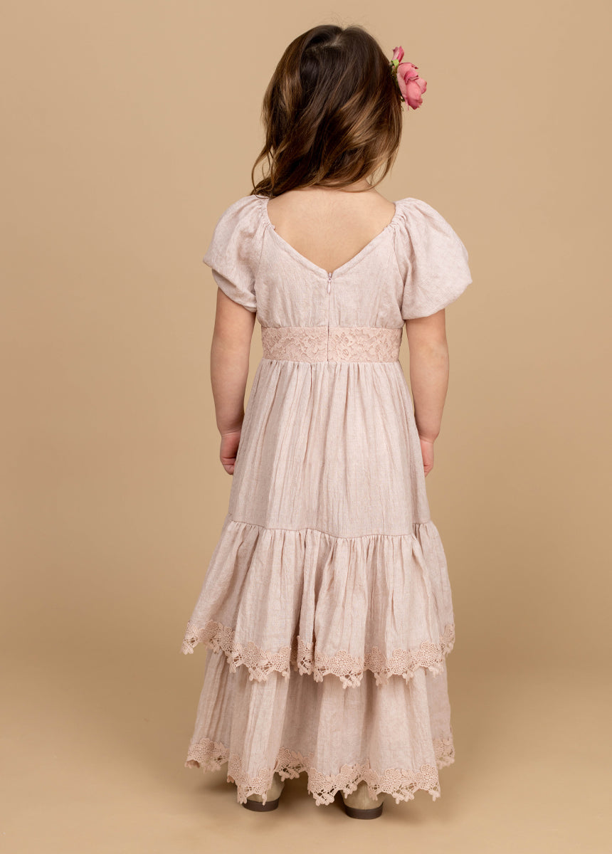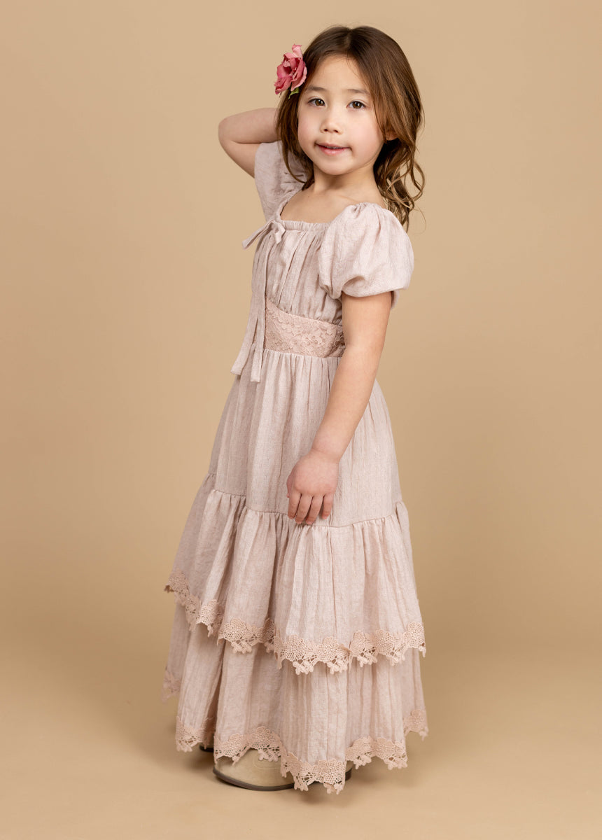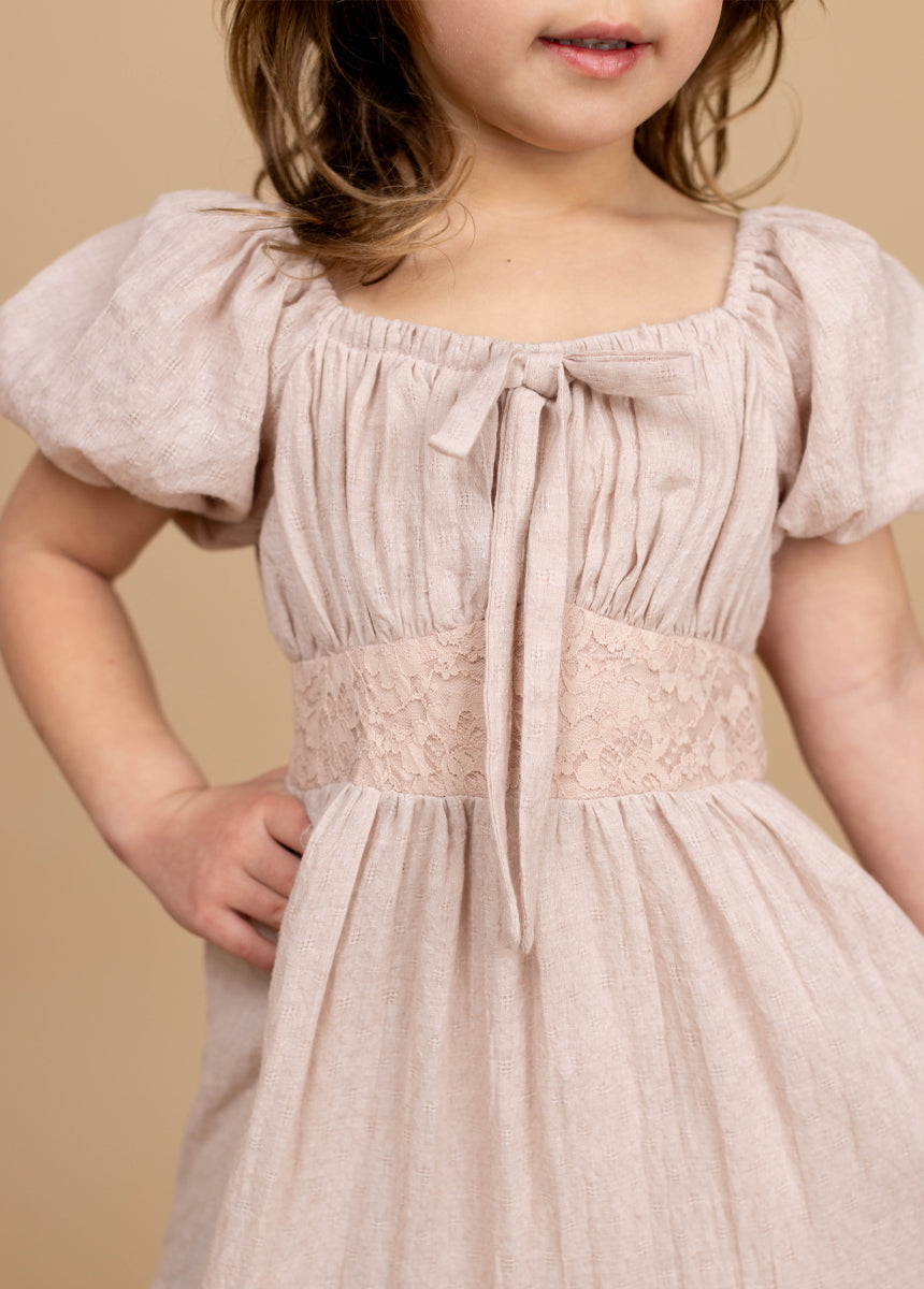 The Casidy Dress is a stunning choice for both casual and special occasions, with its intricate lace details, soft gathers, and graceful silhouette. Crafted from textured crepe, this dress features delicate lace trim and soft gathers that create an enchanting silhouette, ideal for special occasions or playful days. With its soft sweetheart neckline, full bubble sleeves, and beautifully tiered skirt, the Casidy Dress is a must-have for any little fashionista.