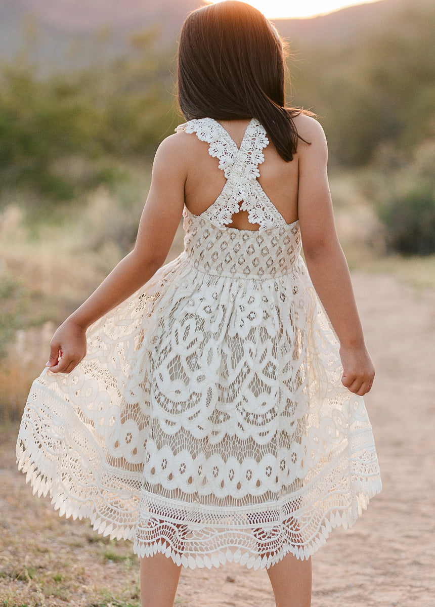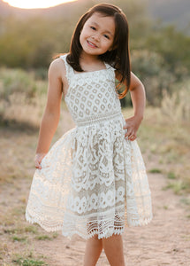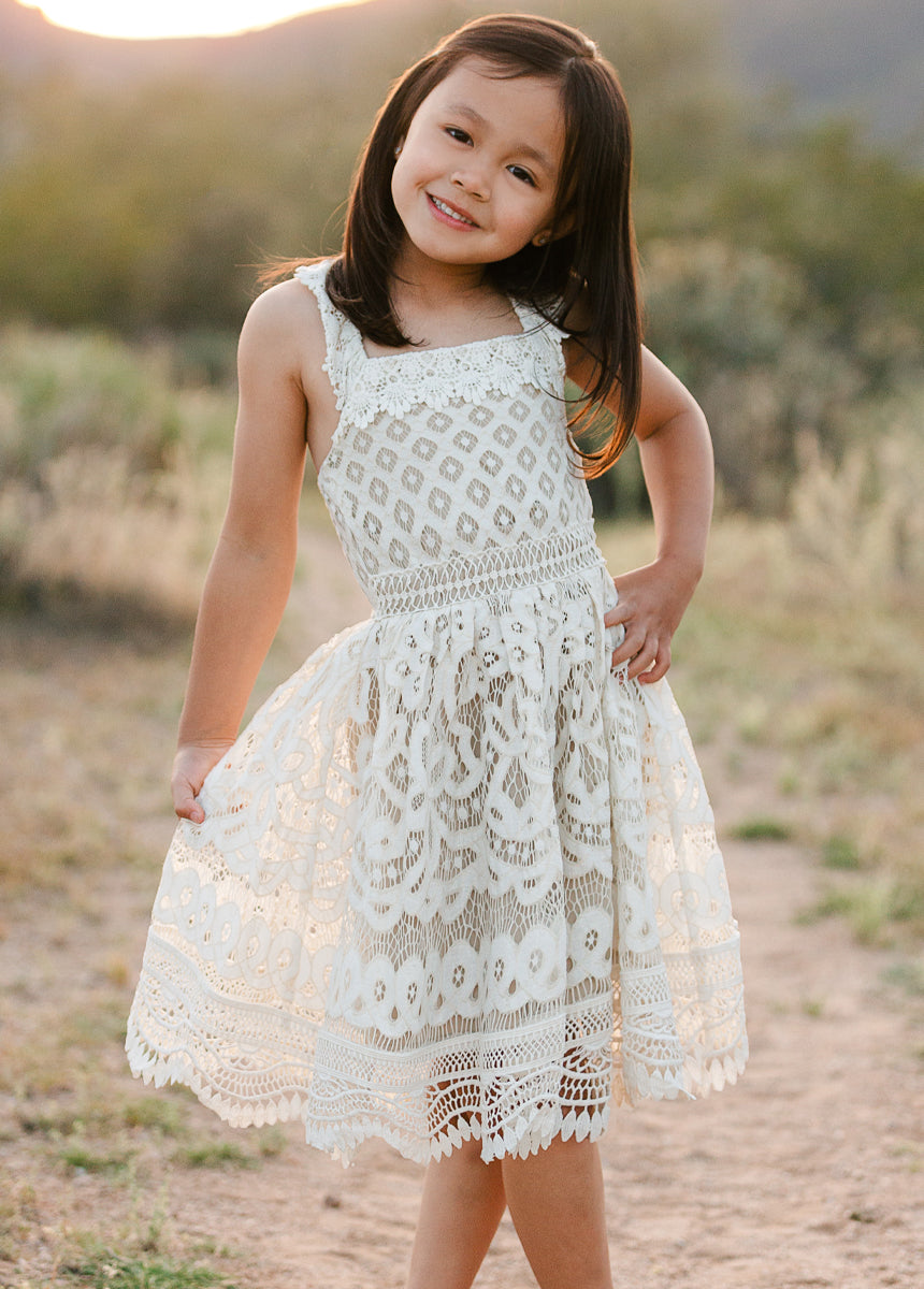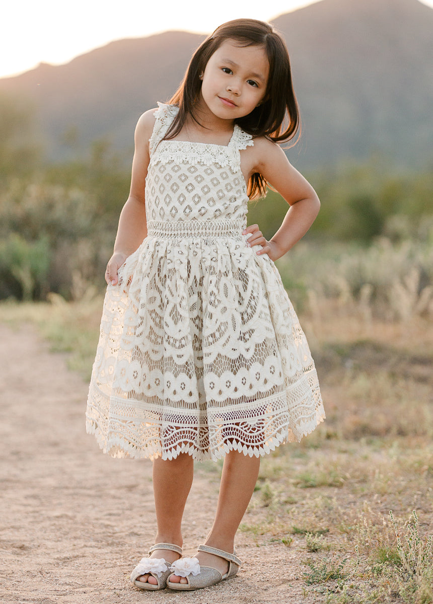 Introducing the Caspia Dress in Cream - for the ultimate girly-girl! With timeless lace and scalloping details, this dress is a must-have for any wardrobe. Perfect for all occasions, add a touch of elegance and fun to your little one's style.