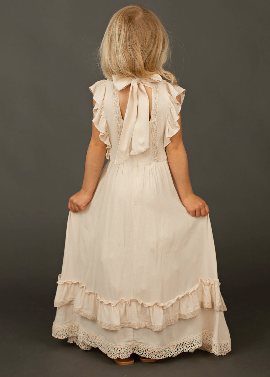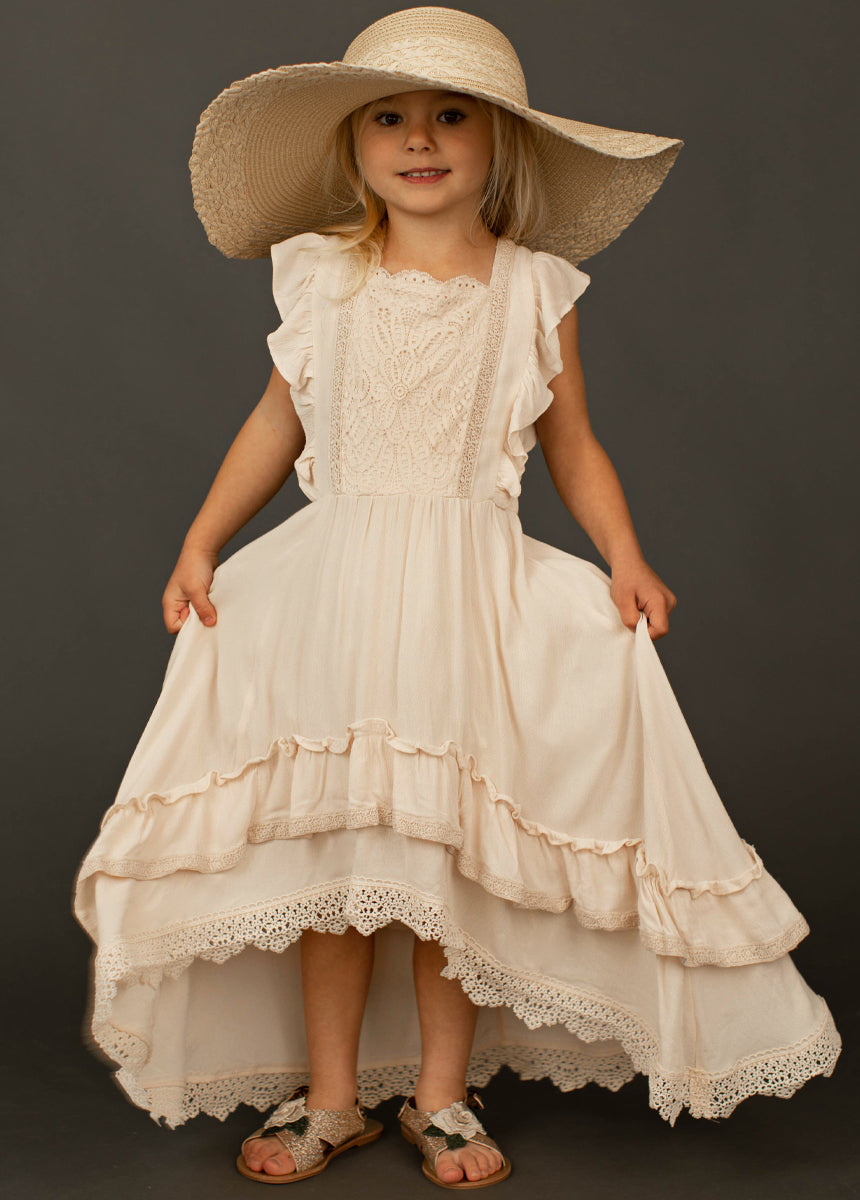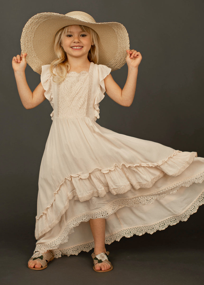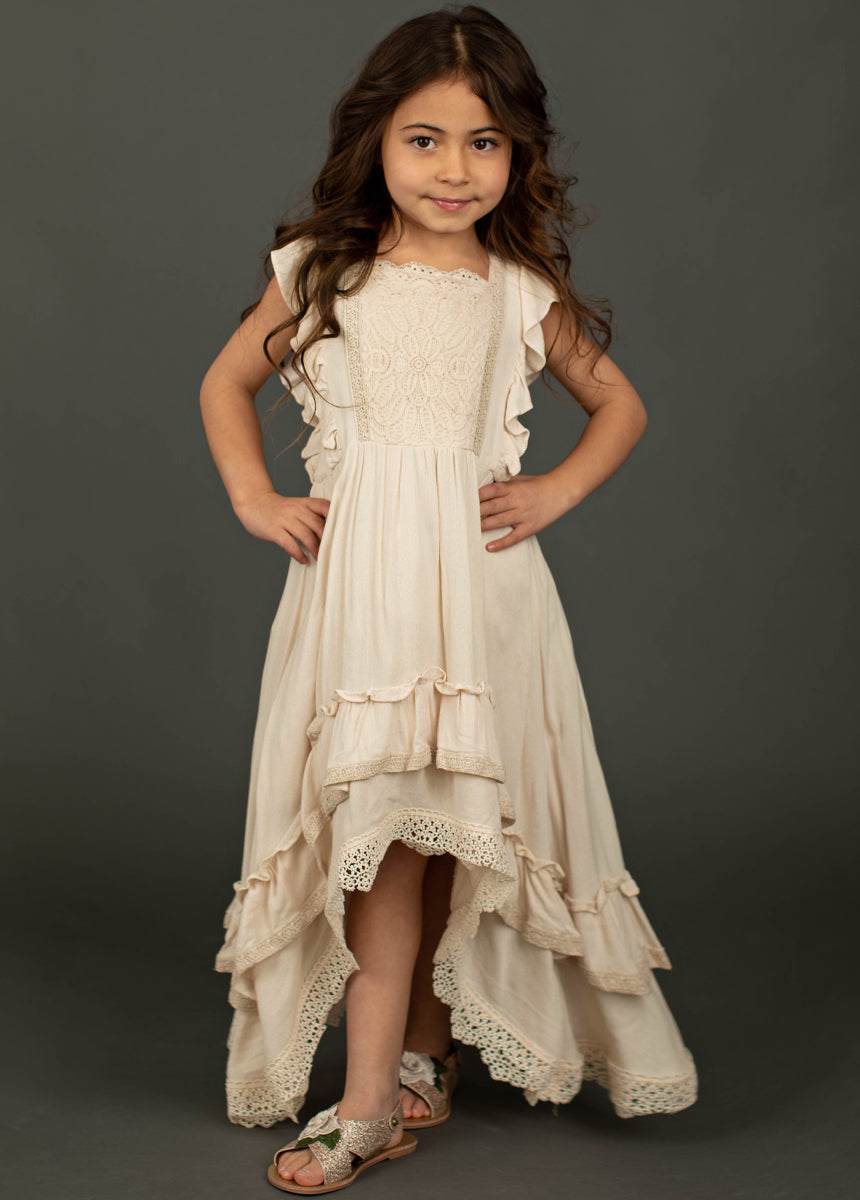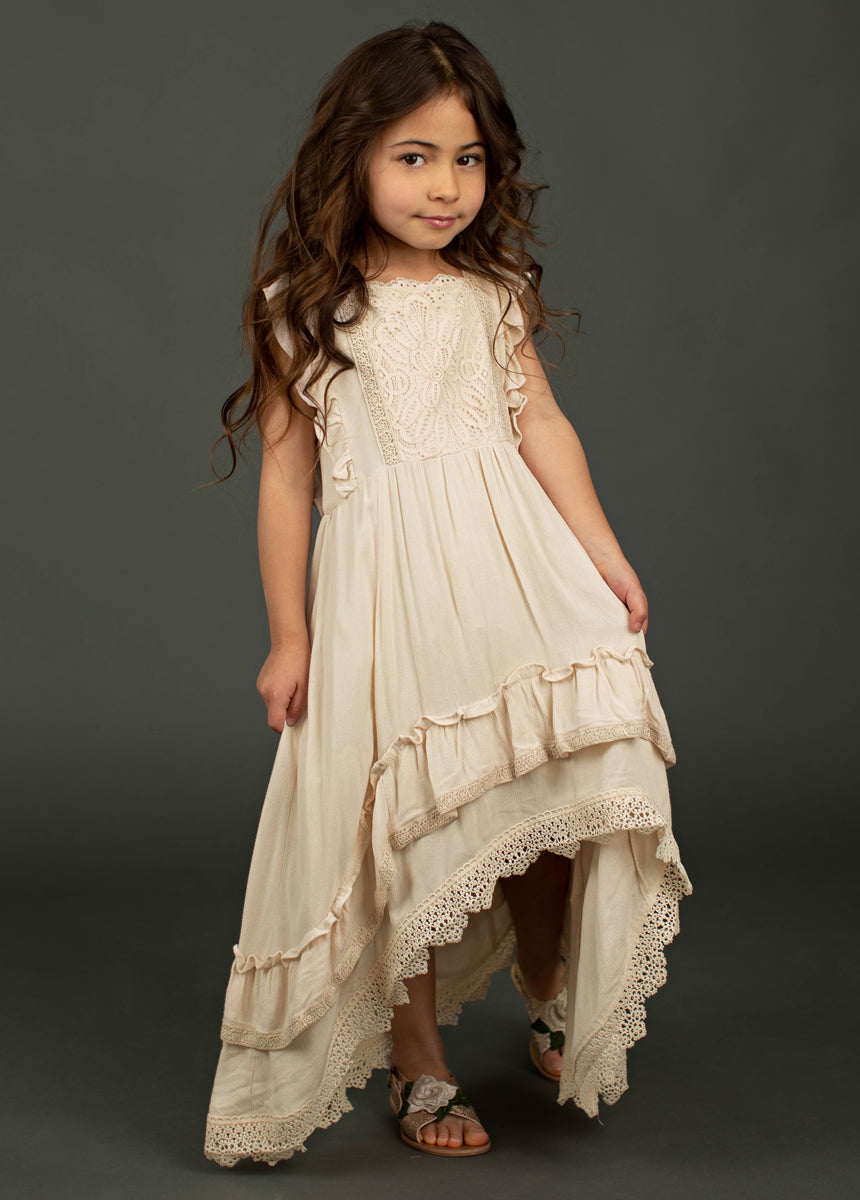 A soft and full tiered high-low maxi dress with a delicate embellished bodice and accented crochet trim throughout.