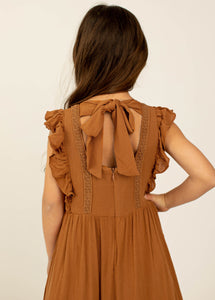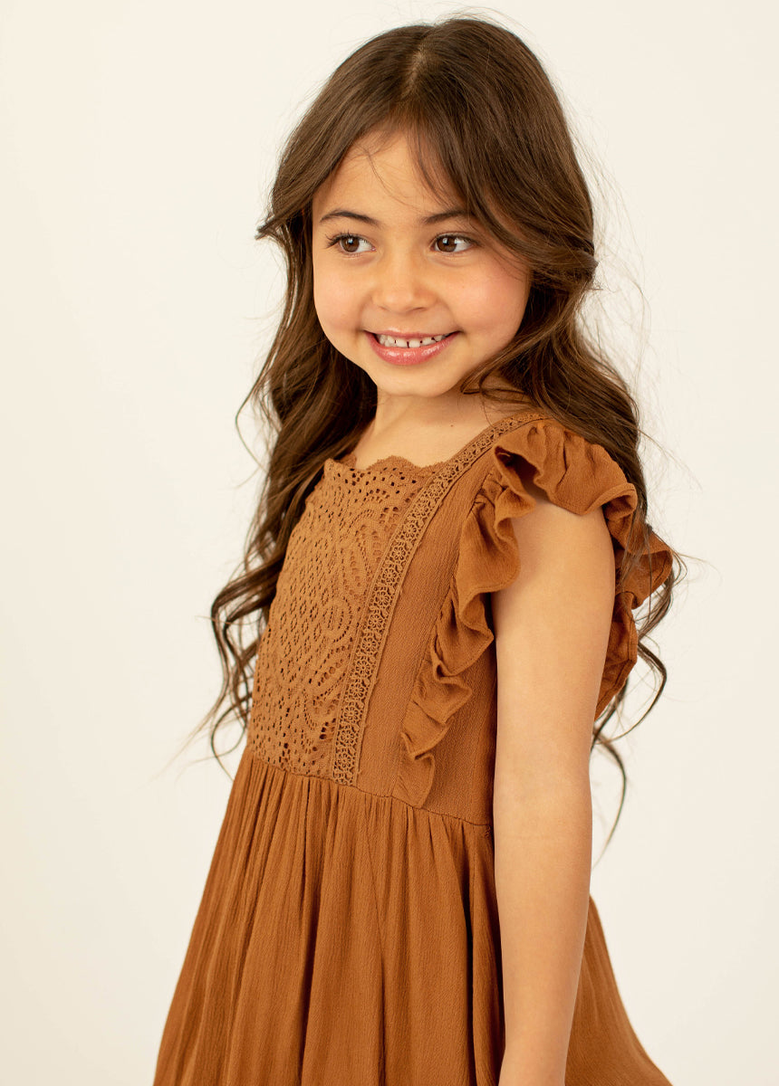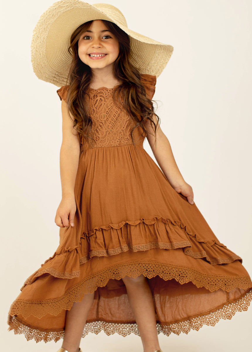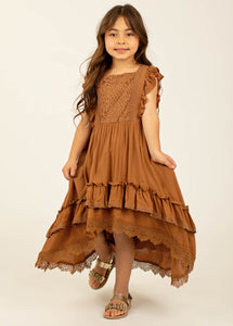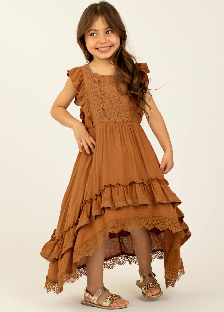 A soft and full tiered high-low maxi dress with a delicate embellished bodice and accented crochet trim throughout.