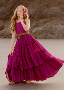 Introducing the Catrin Dress in Berry, a vibrant twist on our beloved style that your little one will absolutely adore! This playful maxi dress features a large sweep, making it perfect for twirling at any occasion. With a fitted bodice and charming back ruffle details, this dress adds a touch of elegance to every outfit. The convenient back tie detail and invisible side zipper ensure a comfortable fit, while the fully lined design provides extra quality and comfort. Make the Catrin Dress in Berry a standout piece in your child's wardrobe today!