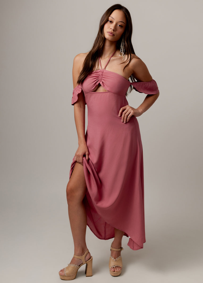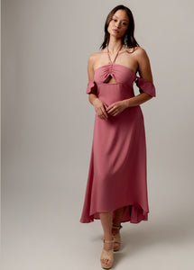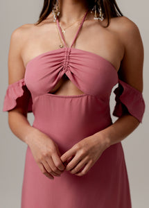 The Chillie Dress is designed with a halter neckline and an adjustable tie at the back, giving you a customizable and flattering fit. Off-shoulder short flutter sleeves add a soft, feminine touch that feels effortlessly elegant. Gentle gathering at the center bust enhances the shape, while the slightly gathered skirt flows beautifully from the waist. Finished with a durable double-stitched hem, this dress is perfect for brunch dates, weddings, or any special occasion.